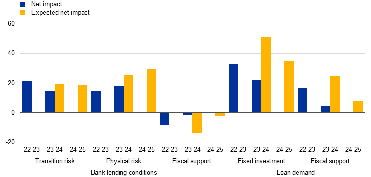 Notes: In panel a), net percentages are defined as the difference between the share of banks reporting a tightening of credit standards (blue line) or a tightening impact of climate change (dots) and the share of banks reporting an easing or easing impact. The solid line refers to actual values over the past three months, while the dashed part of the line refers to banks’ expectations over the next three months. Dots refer to actual values over the past 12 months, except for the last dot which refers to banks’ expectations over the next 12 months. Panel b) shows the main factors through which, according to the banks surveyed, climate change contributes to a net easing/net decrease (negative values) or net tightening/net increase (positive values) in bank lending conditions/loan demand for firms. Each period is from the third quarter of the first year to the second quarter of the following year. Blue bars show actual values over the past 12 months, while yellow bars refer to the expected net impact indicated by banks 12 months ago.