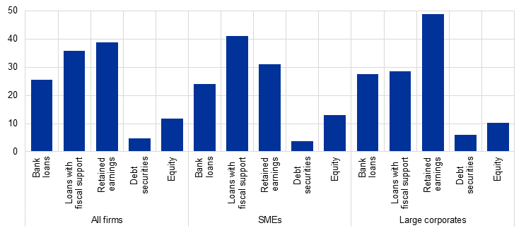 Climate-related fiscal support improves the likelihood of a loan being approved and mitigates the financing costs for firms, facilitating investment in the green transition. According to banks participating in the BLS, climate-related fiscal support, in the form of state guarantees or subsidies for example, can help to reduce banks’ exposure to climate risks, thereby easing credit conditions and helping to boost loan demand (Chart 3, panel b). However, banks indicated in the July 2024 BLS that the actual beneficial impact of climate-related fiscal support on bank lending conditions over the previous 12 months (blue bars) was substantially lower than they had expected a year earlier (yellow bars). The positive impact that fiscal support can have on firms’ green investment decisions is also confirmed by the firms themselves, especially small and medium-sized enterprises (SMEs). Meanwhile, large firms point in particular to the important role played by retained earnings as a source of funding for planned green investment, while capital markets still play a smaller role (Chart 4).[11]
