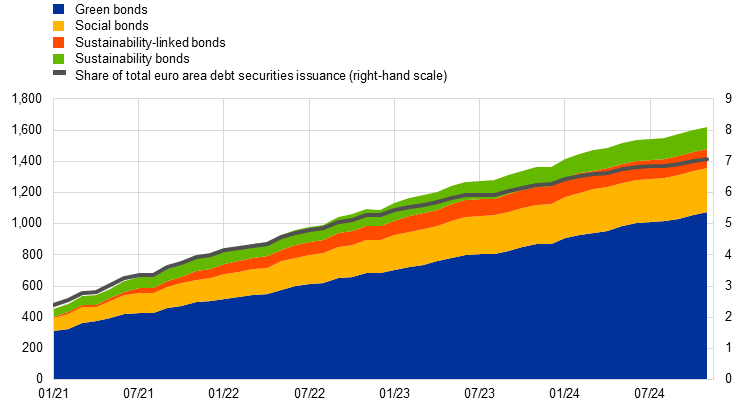 Notes: “Share of total issuance” refers to the amount of all sustainable securities as a share of all debt securities issued in the euro area. The latest observations are for November 2024.