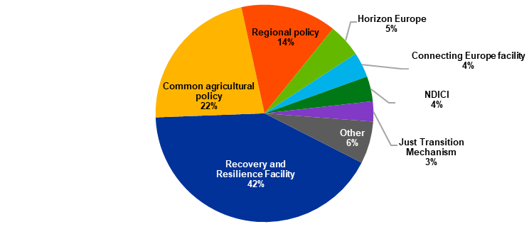 The single largest share of the climate-related RRF funds goes to firms, but so far the absorption rate of these funds has been low (Chart 6, panel b). The support measures offered to firms, amounting to 43% of the climate-related RRF funds, come mostly in the form of subsidies and tax credits which aim to promote green investments in areas such as energy infrastructure, company electric vehicles and greater building energy efficiency. So far, however, the absorption rate of these funds has generally been low.[16] By mid-2024 only 20% (around €55 billion) of the climate-related RRF funds had been disbursed, with the remainder still available to be spent until the end of 2026. The low absorption rate may be partly related to bottlenecks caused by insufficient administrative capacity and complex governance structures. The performance-based nature of the RRF means that financial support is not provided until pre-defined milestones and targets have been met. By contrast, as much as 40% (around €150 billion) of the climate-related funds committed under the current MFF had been disbursed by the end of 2023.