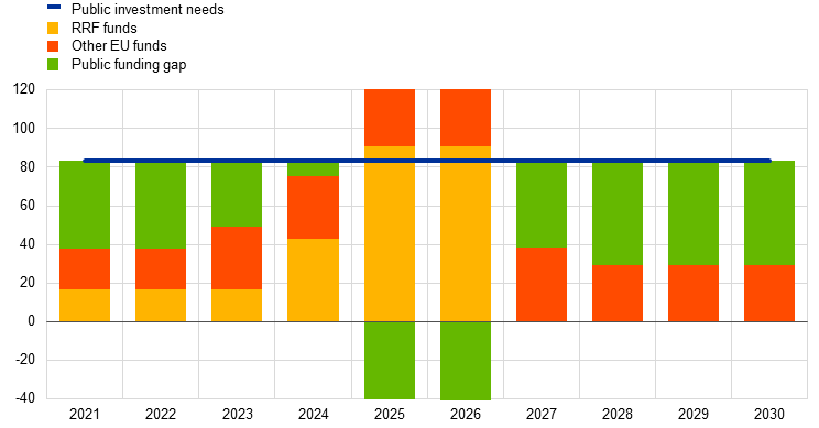 The available EU funds can largely cover the public green investment needs up to 2026, although a green public funding gap may open up when the RRF expires. No benchmark has been established yet to determine the optimal role of the public sector in mitigating climate change. That said, a broad estimate of the public share of the additional investment needs may be derived from the weighted public investment share of each sector.[17] This stylised exercise results in an overall public sector share of around 17% of the additional climate-related investment needs over the period from 2021 to 2030, which is equivalent to around €83 billion per year.[18] Compared with the available EU funds and under the assumption of full disbursement of the RRF funds by the end of 2026, the green public funding gap would be limited to an average of €20 billion per year (around 24% of the public funding needs) between 2025 and 2030. This result is sensitive to the underlying assumptions, however, especially the full use of the RRF envelope. The green public funding gap is likely to become substantially larger after the RRF expires at the end of 2026 (green bars in Chart 6, panel b). Yet, limited EU public funds after 2026 may reduce the ability of the public sector to crowd in private investment.[19]