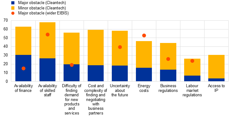 Notes: The EIBIS does not include information on cost and complexity of finding and negotiating with business partners or on access to intellectual property (IP). For details of the Cleantech Survey, see EPO/EIB, op. cit.