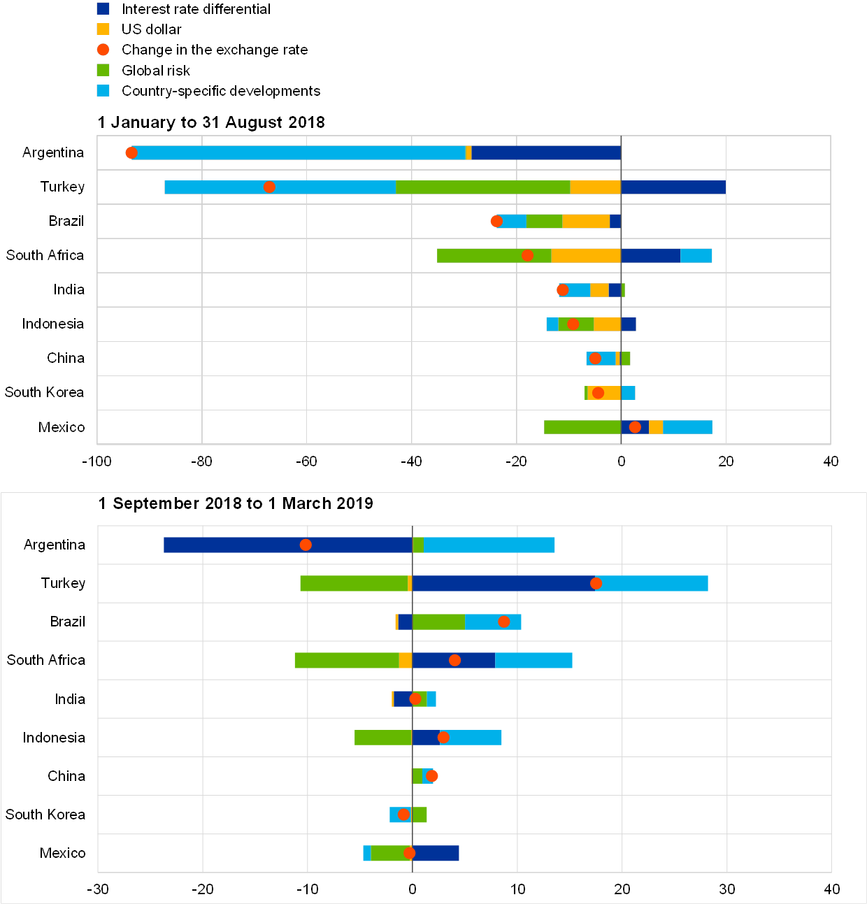 The subsequent recovery, on the other hand, appears to have been driven mainly by domestic policy reactions in emerging market countries and positive idiosyncratic developments (see Chart C). The decomposition shows that global risk has continued to put downward pressure on emerging market currencies. However, the role of the US dollar factor has been more limited since August 2018, suggesting that developments in the United States have not generated additional spillovers to emerging market currencies since then. On the other hand, country-specific factors have tended to bolster emerging market currencies, suggesting that domestic conditions have become somewhat more positive and growth prospects have improved in emerging economies since the financial market turmoil during the summer of 2018.