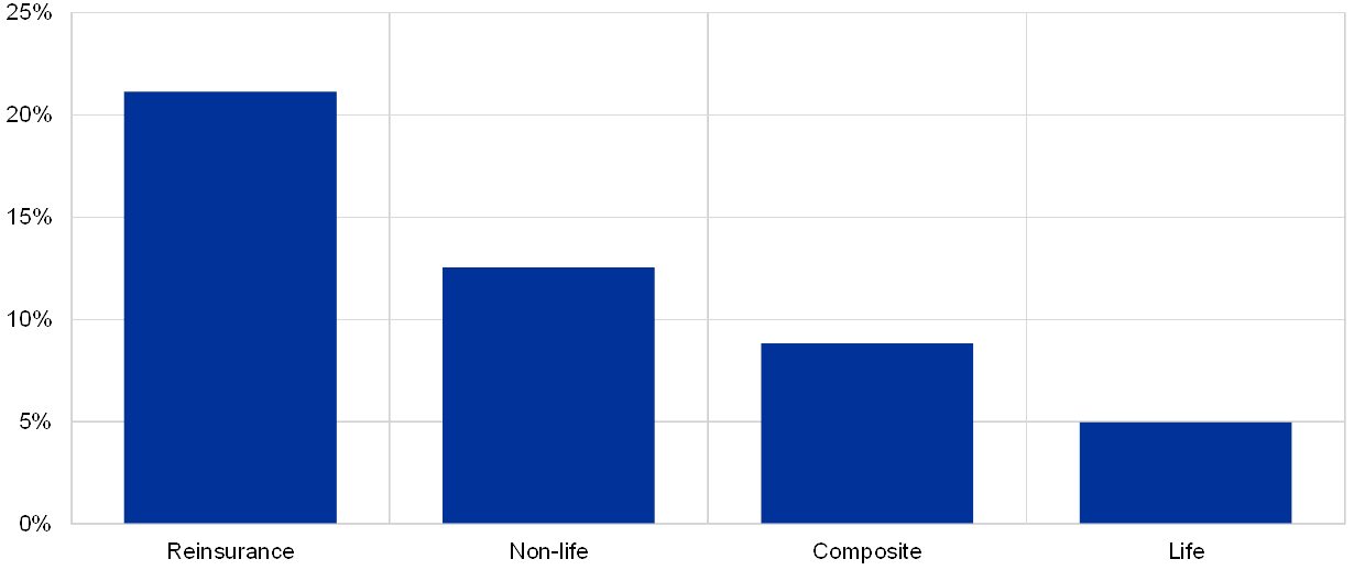 The reinsurance sector stands out for its significant share of cross-border business activity, with a third of premiums written via non-domestic branches. Of these, 7% were written in other euro area countries and 26% in the rest of the world. Cross-border activity can expose reinsurers to currency risk, which they may need to hedge using derivatives. Indeed, an analysis based on end-2017 data has shown that foreign exchange contracts are the second most prevalent derivative contract held by the euro area insurance sector after interest rate derivatives.[6]