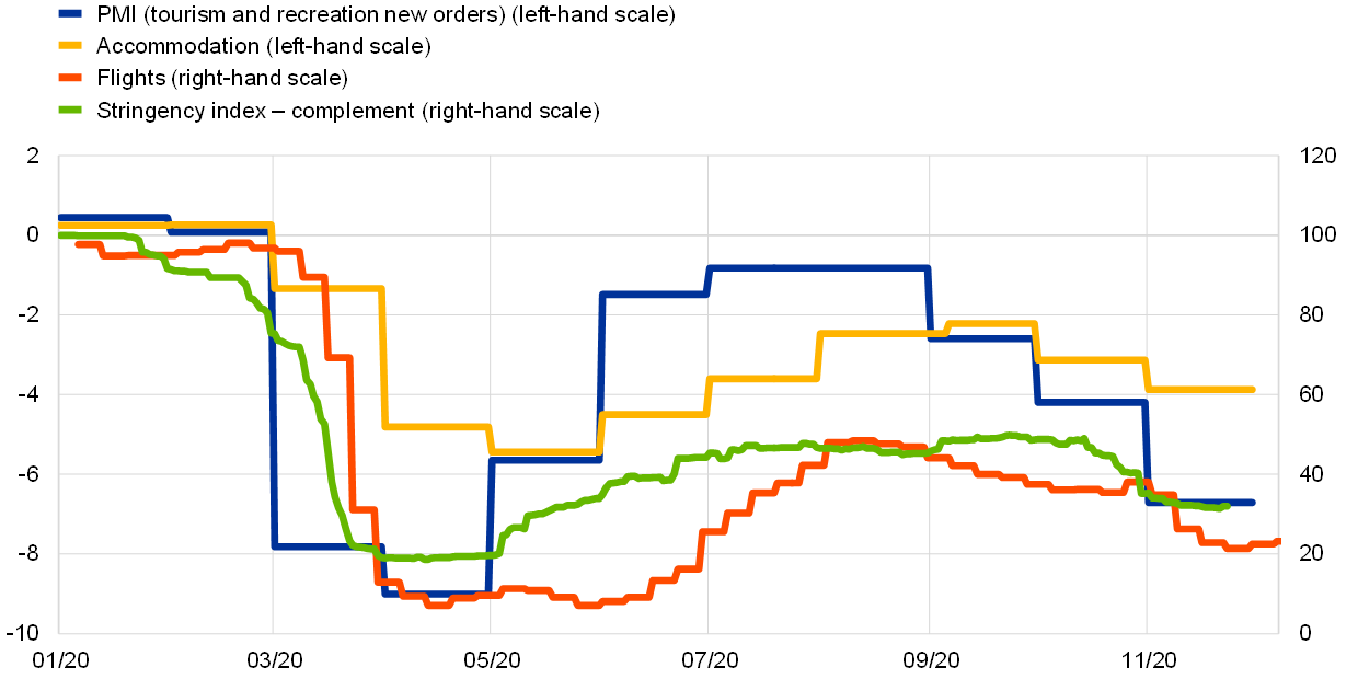 Notes: The PMI is for the EU. Accommodation is measured by the European confidence indicator. The data on flights are for Germany, Spain, France and Italy only. The stringency index is an average across euro area countries weighted by the share of tourist arrivals in 2019. Complements (100-value, where 100 is maximum stringency) of the stringency index are reported so that an increase in the series corresponds to easing and a decrease to higher stringency.