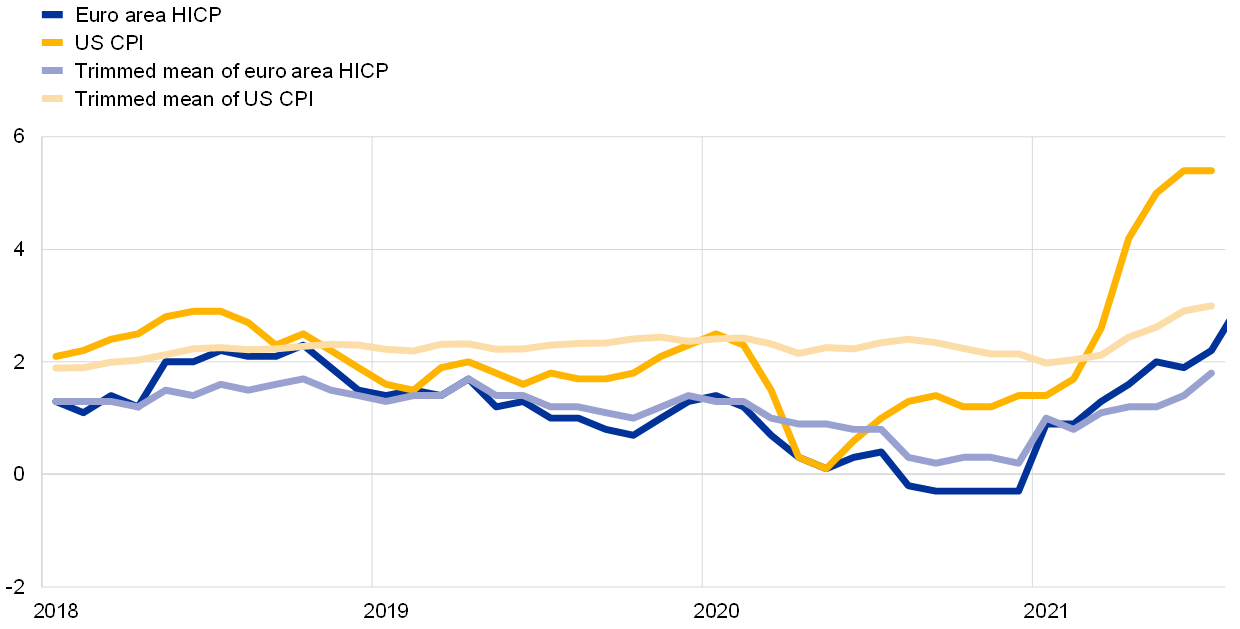 Notes: HICP stands for Harmonised Index of Consumer Prices and CPI for Consumer Price Index. The trimmed mean excludes 16% of items for the US CPI (calculation by the Federal Reserve Bank of Cleveland) and 15% of items for the euro area HICP (based on ECB calculations). The trimmed means remove around 8% from each tail of the distribution of price changes in the euro area HICP and the US CPI each month. The annual rates of change are calculated using rescaled weights. The latest observations are for July 2021, except for euro area HICP, for which the latest observation is for August 2021.