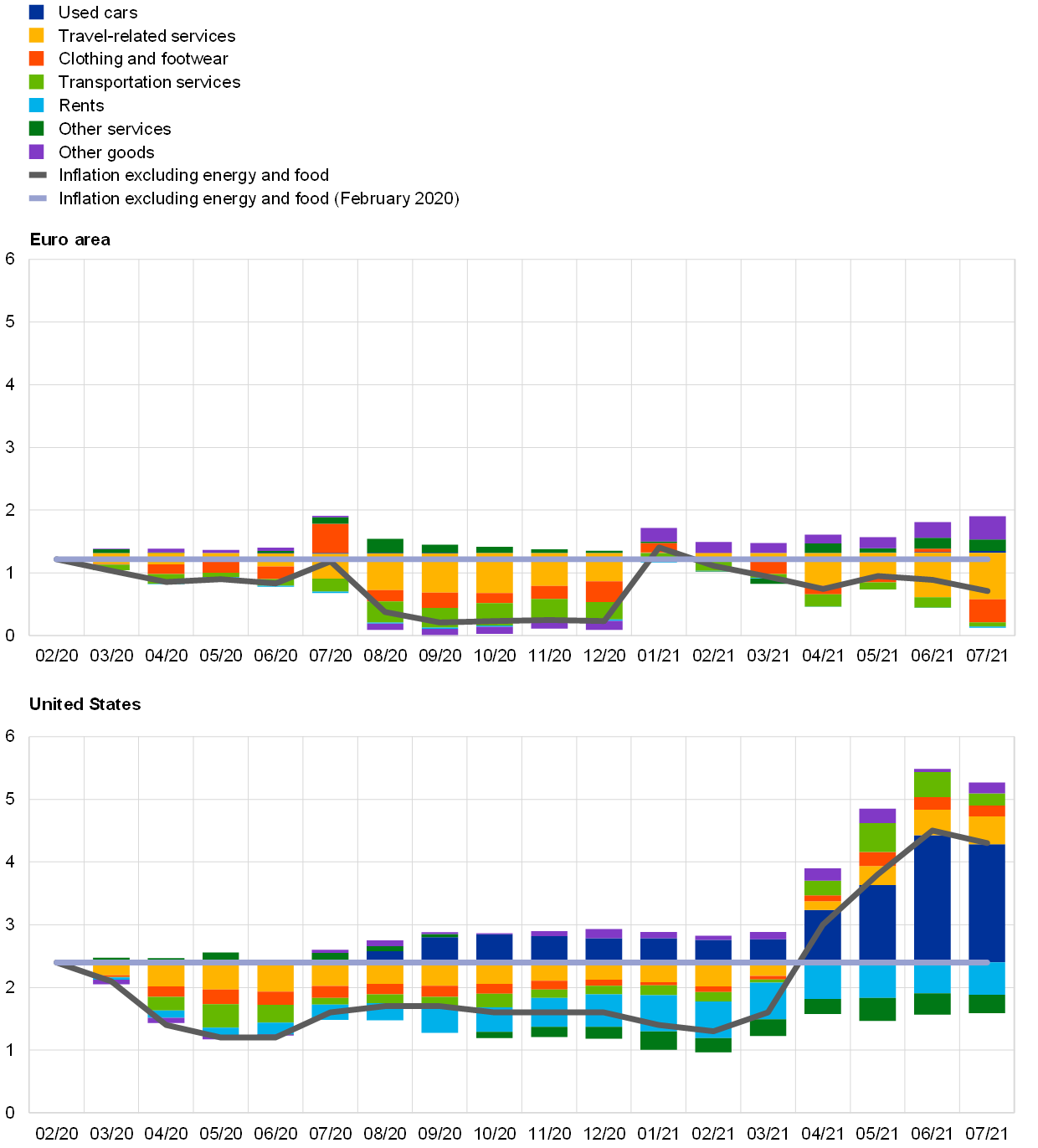 While in the United States CPI inflation less food and energy is now significantly higher than before the pandemic, in the euro area HICP inflation excluding energy and food (HICPX) has remained lower than before the pandemic (Chart C).[2] In the euro area, HICPX inflation stood at 0.7% in July 2021, compared with 1.2% in February 2020. In contrast, CPI inflation less food and energy in the United States started from a substantially higher level (2.4% in February 2020) and stood at 4.3% in July 2021. In addition to the still larger amount of slack in the euro area, these differences in inflation developments can be attributed to several factors. First, US prices for used cars and trucks soared during the second quarter of 2021 for a number of reasons: new cars, a close substitute, were less available because of a slowdown in production stemming from semiconductor shortages, rental car companies reduced sales of their used cars amid stronger demand for car rentals as the economy re-opened, preferences shifted away from public to private transport, and household disposable income was boosted by fiscal stimuli – pushing up demand for used cars in the United States. The rise in prices for used cars and trucks alone represented, at 1.5 percentage points, around half the increase in US CPI inflation less food and energy from 1.4% in January 2021 to 4.3% in July 2021. In the euro area, by contrast, there has been some increase in prices for new cars in recent months – partly linked to supply chain bottlenecks – but prices for used cars did not on average rise very markedly in the absence of very strong increases in demand. Furthermore, the weight of used cars in headline HICP is considerably smaller (1.1% compared with around 3% in the United States). Second, US prices for travel-related and transportation services rose strongly following the easing of containment measures, which has led to a substantial positive contribution to CPI inflation over the last few months. In the euro area, containment measures were lifted later, and thus the response of transportation and travel-related services has lagged behind that in the United States.[3] Rents have slightly moderated the divergence between inflation developments in the United States and the euro area. Whereas they have been a drag on inflation less food and energy in the United States, this has not been the case in the euro area, reflecting a larger weight in the US consumption basket and stickier euro area rents during the pandemic. There are, however, some common features in the US and euro area core inflation developments. Both exhibited an increasing contribution from consumer goods excluding volatile items such as clothing and footwear and used cars (Chart D). This likely reflects a combination of factors, such as the recovery of demand after lockdowns, but also some pass-through of global pipeline pressures triggered by higher input prices (including for commodities), shipping costs and bottlenecks for some inputs.[4]