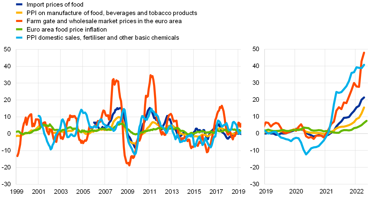 Overall, the euro area’s direct dependence on the region involved in the war is limited apart from specific commodities, but food prices are strongly affected, given the developments in global commodity prices. The euro area’s imports of grains, oil seeds and fertilisers are being hampered owing to the war. Food price inflation is also strongly affected via higher world market prices of these inputs for agricultural production, along with the strong increase in energy prices. Previous episodes of rising food prices were followed by economic adjustments, and food price inflation tended to moderate in the medium term. This time inflation can be expected to stay high in the coming months, despite some counterbalancing factors. Some of the supplies affected by the war could be substituted by supplies from the rest of the world, but at high prices. There is also the possibility of increasing crop production in the euro area (by bringing “ecological focus areas” into cultivation and re-prioritising the maize produced), which would help moderate the impact of the war on grain markets, at least in terms of quantity.[17] Reduced supply of animal feed from Russia and Ukraine can partly be compensated by more supply from other regions (e.g. Latin America), but most likely at higher prices. These counterbalancing measures are unlikely to limit food price increases very much in the short term, as several inputs are difficult to substitute at short notice and are expected to be the main drivers of future food inflation developments.[18] For example, owing to the reduced supply and high price of fertiliser, some pipeline pressures are expected to persist in 2023.