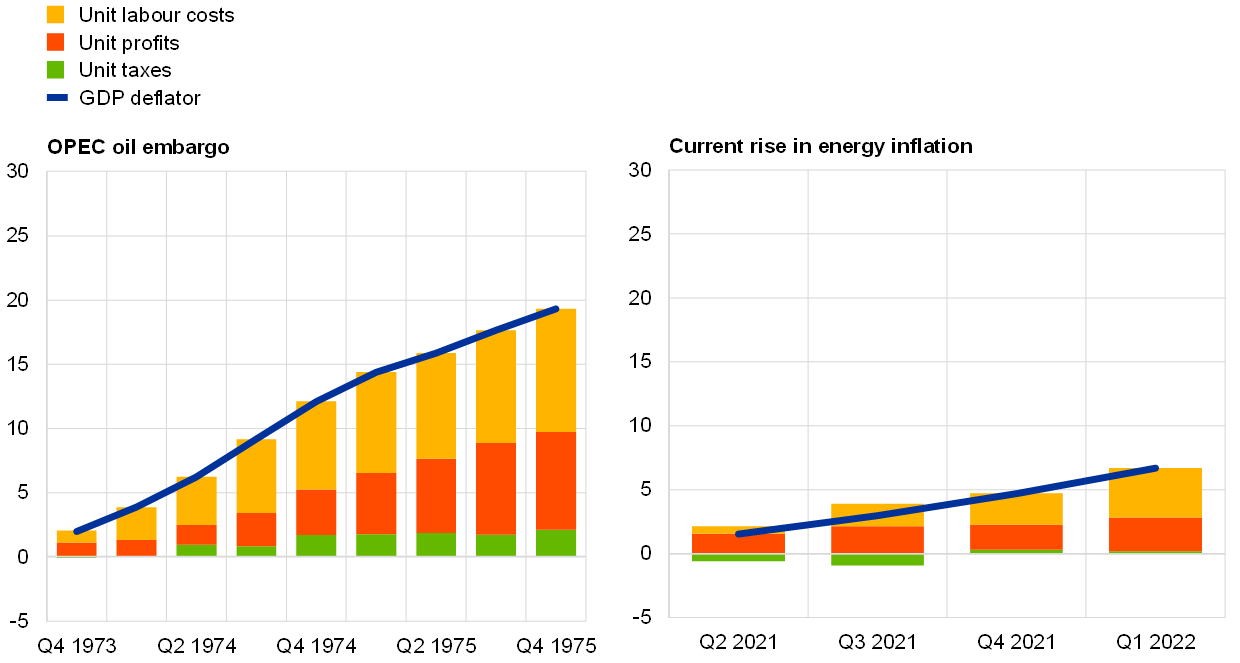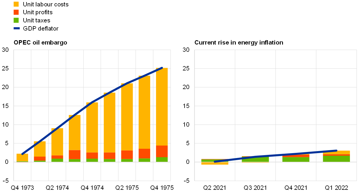 Wage share dynamics in the United States are similar to those in the euro area today, but these differed markedly in the 1970s. In the United States, rising energy prices have induced a smaller income loss through the terms of trade today (1.5 percentage points of GDP) than in the 1970s (3.0 percentage points of GDP).[6] However, contrary to the euro area, the US wage share declined slightly in the aftermath of the OPEC oil embargo, mainly reflecting losses in real consumer wages, while the experience in the two jurisdictions today is similar (Chart B, panel a). The drivers of the GDP deflator in the United States today are similar to the experience of the 1970s, although smaller in magnitude, with rising unit profits playing a significant role in both episodes (Chart B, panel b). Overall, the US experience shows that the GDP deflator may increase considerably as a result of energy price shocks, despite limited wage indexation mechanisms and, especially today, low net energy dependency and strong monetary policy credibility.
