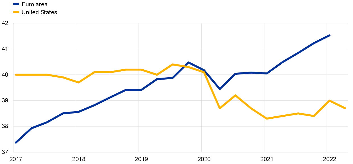 The latest observations are for the first quarter of 2022 for the euro area and the second quarter of 2022 for the United States.