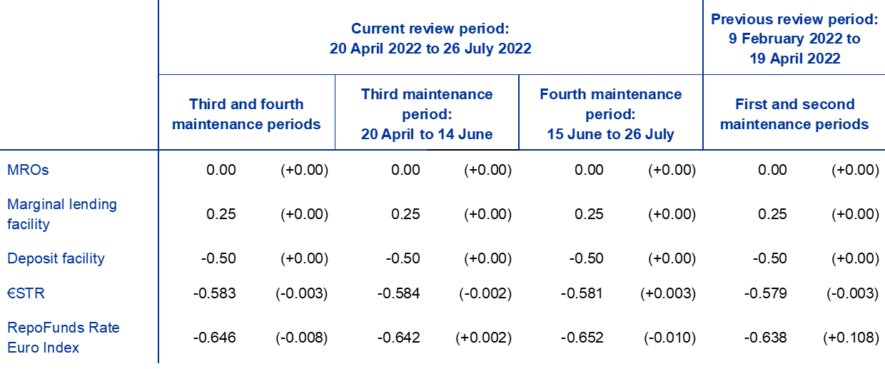 This box describes the ECB’s monetary policy operations and liquidity developments during the third and fourth reserve maintenance periods of 2022. Together, these two maintenance periods ran from 20 April 2022 to 26 July 2022 (the “review period”).