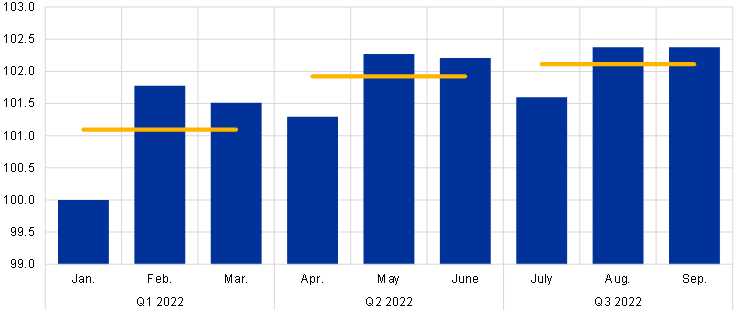 Notes: The chart shows the profile of estimated monthly real GDP from January to September 2022 based on an interpolation of actual quarterly GDP using monthly industrial, construction and services production as explanatory variables. The monthly indicators are used up to their latest available observations in the third quarter and an unchanged level thereafter up to September. The latest observations are for the third quarter of 2022 for quarterly GDP, August 2022 for industrial and construction production and June 2022 for services production (with estimates for July and August based on available country data).
