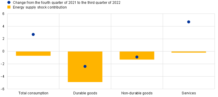 The recent increase in real consumer spending in the euro area masks heterogeneous developments in individual consumption components. Total private consumption in the euro area increased significantly in the second and third quarters of 2022, mainly supported by consumption of services, which rose sharply after subdued growth at the beginning of the year (Chart A).[1] By contrast, consumption of non-durable goods fell for the third quarter in a row. Moreover, consumption of durable goods continued its downward trend (which began in the last quarter of 2021) up until the second quarter of 2022, after which it began to improve in the third quarter. While the recovery in total private consumption reflected several factors, including the widespread loosening of pandemic-related restrictions and the gradual easing of supply bottlenecks, the strong rise in energy prices created significant headwinds to consumption growth through its effect on households’ purchasing power.[2] This box aims to quantify the impact of the recent increase in energy prices on real consumer spending in the euro area. It focuses on energy supply shocks that have become increasingly significant since mid-2021, particularly with the Russian invasion of Ukraine in early 2022.[3]