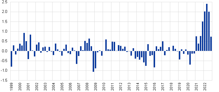 The accuracy of the Eurosystem and ECB staff short-term inflation projections for the euro area deteriorated following Russia’s invasion of Ukraine before improving in the last quarter of 2022. There were euro area inflation surprises on the upside in 2021 and 2022. In April 2022 the ECB published an analysis of the reasons for these surprises and compared the performance of the staff projections with forecasts by other institutions and the private sector.[1] After this publication, the performance of the staff short-term projections for the next quarter initially deteriorated further following dramatic spikes in energy and food commodity prices in the wake of Russia invading Ukraine in February 2022. In the subsequent quarters, while still surprising persistently on the upside, the magnitude of errors was reduced and in the last quarter of 2022 this was back within the range of absolute projection errors observed before the pandemic (Chart A).