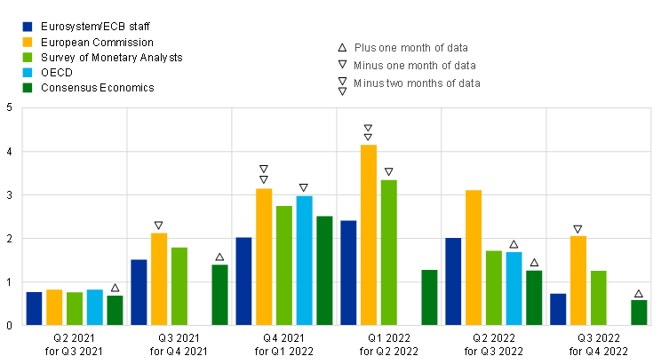 Notes: For other forecasters, the errors are shown for publications where the corresponding cut-off date is closest to that of the Eurosystem/ECB staff projections. For the SMA, the median of survey respondents is shown. The arrows indicate differences in the months of available HICP data at the cut-off point for each publication relative to the Eurosystem/ECB staff projections. An upward arrow indicates one additional month of data, a downward arrow indicates one month less data, and two downward arrows indicate two months less data. Quarterly projections from the OECD are only available twice per year and therefore no error is shown in the first and third quarters.