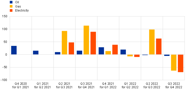 Errors in terms of conditioning assumptions for energy commodity prices continue to account for a significant albeit declining share of the overall Eurosystem/ECB staff inflation projection errors (Chart C). As with projections made by all other major institutions, the Eurosystem/ECB staff projections depend on a set of technical assumptions about the evolution of key financial and non-financial variables. These assumptions, such as the future evolution of energy commodity prices, are “technical” in the sense that they are treated as exogenous to the projections and, in most cases, are set according to market-based measures such as futures prices. As such, these are not adjusted according to expert assessment by staff. A key finding of the analysis of inflation projection errors published by the ECB in April 2022 was that errors in these assumptions, particularly for energy commodity prices, accounted for, on average, around three-quarters of the overall errors up to the first quarter of 2022. Since then, the conditioning assumptions continued to play a large, albeit declining, role in the inflation errors in the second and third quarters of 2022, and for the fourth quarter of 2022 they played only a negligible role (see the red, green and blue bars in Chart C). The assumptions for energy commodity prices have overall surprised sharply on the upside in all quarters over the last two years except for the fourth quarter of 2022 (Chart D). Given the decoupling of wholesale gas and electricity prices from oil prices, it became clear through the course of 2021 that a reliance on oil prices as an indicator for energy inflation forecasting was no longer sufficient.[3] As a consequence, more granular tools needed to be developed amid the surge in gas and electricity prices. New technical assumptions – also based on futures prices – for gas and electricity prices have, however, been much larger and more erratic than for oil prices, with some huge under-predictions in the second half of 2021 and in the third quarter of 2022 and large over-predictions in the final quarter of 2022. The contribution of errors related to consumer energy prices (summarised by the red bars in Chart C) has been persistently large, in part reflecting the complexity of the pass-through of wholesale gas and electricity prices to consumer prices, whereby regulation, fiscal measures adopted by euro area countries to compensate for high energy prices, contract types and other price setting and price measurement factors imply a more heterogenous and uncertain pass-through than is the case for oil prices to transport fuel prices. Although the pass-through of gas and electricity prices is typically more delayed, the speed of the pass-through may have increased over the past year. This may have contributed to the large under-predictions of consumer price inflation. Moreover, forecasters may have overestimated the impact of fiscal measures in reducing inflation.