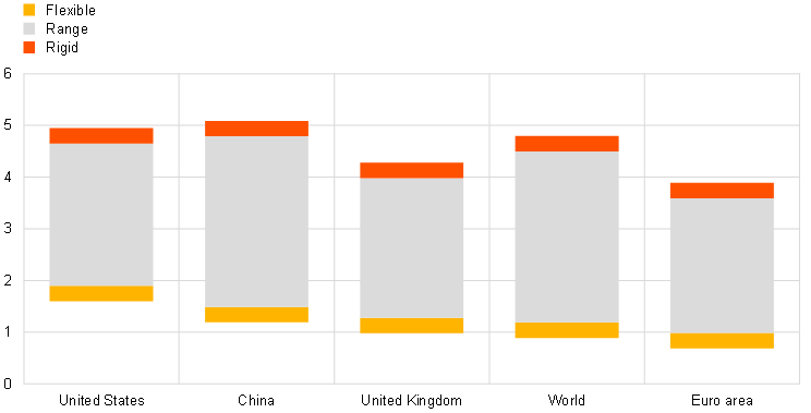 Welfare losses can be sizeable, albeit rather heterogenous across economies. From a global perspective, welfare losses, captured by the change in gross national expenditure (GNE), are estimated to range between 0.9% (flexible setup) and 5.3% (rigid setup) (Chart B, panel a). In line with the interpretation discussed above, this suggests that losses could be sizeable in the near term should a sharp correction in trade flows take place (rigid setup). Once the rigidities dissipate, losses are gradually absorbed as substitute inputs of production are found either via increased domestic production or increased intra-bloc trade. This in turn increases employment and reduces the price of foreign inputs, limiting the losses from trade fragmentation in the long run (flexible setup). Chart B (panel b) presents welfare losses for selected countries. Welfare losses vary widely across economies and range between 0.2% and 6.9% in the flexible setup and between 0.4% and 10.5% in the rigid setup. While all countries lose from fragmentation, countries that rely heavily on GVCs and trade extensively with the other bloc experience the largest losses. This contrasts with large economies, such as the United States and China, which see smaller losses even in the rigid setup. Losses in the euro area are also relatively mild as, like the United States and China, its large internal market more easily allows substitution by domestic intermediate inputs after the shock. Nonetheless, its losses are somewhat greater than those of the United States or China owing to the greater trade openness of the euro area. The estimated effects in the flexible setup are broadly in line with the recent literature, which finds muted effects of trade fragmentation in the long run.[13] In the short run, however, trade fragmentation may also involve significant transition costs (rigid setup) as it takes time to reconfigure supply chains.