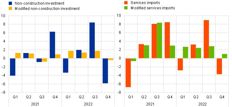 Modified investment and import data series can give a clearer picture of underlying dynamics in the real economy than the headline series. Ireland’s Central Statistics Office computes and publishes a modified data series that is designed to reflect domestic investment activity and abstracts from the erratic volatility seen in IPP data. The “modified investment” series is defined as total investment minus IPP investment and investment in aircraft purchased by leasing companies resident in Ireland.[6] A comparison shows that in the fourth quarter of 2022 euro area non-construction investment fell quarter on quarter by 0.4% according to the adjusted series, but by 5.8% according to the official data (Chart D). Proxies for services imports, calculated by subtracting IPP transactions from services imports, show a similar difference. These modified series exhibit smoother patterns that make it easier to assess the business cycle. Given that the IPP transactions that create the volatility have thus far mainly taken place with firms outside the euro area, the adjustment typically does not distort intra-euro area trade.