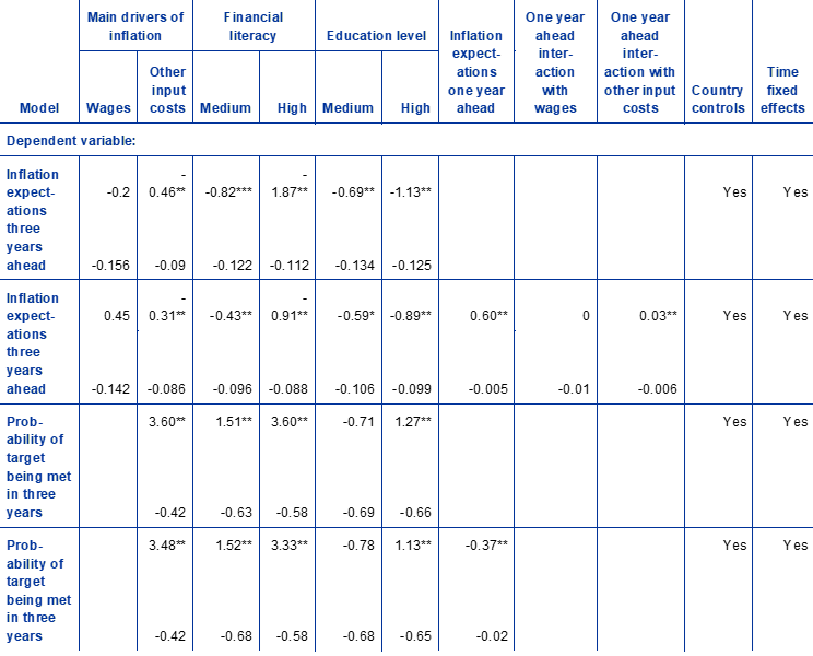 Respondents stating that other input costs are the main driver expect inflation to be less persistent. Specifically, they tend to have lower medium-term inflation expectations and a lower pass-through from short-term expectations to medium-term expectations. Table A quantifies the correlation between answers and medium-term inflation expectations (controlling for education, financial literacy, country and time fixed effects).[8] The results suggest that the input cost explanation is associated with a lower level of medium-term expectations, averaging 0.46 percentage points, compared with a base group of respondents selecting profits as the main factor. Additionally, looking at the pass-through from short-term expectations to medium-term expectations, the conditional impact of respondents answering “other input costs” reflects a pass-through rate of 32% compared with an unconditional pass-through rate of 60%.[9] Finally, the expected probability of the ECB maintaining price stability is 3.5-3.6 percentage points higher for respondents answering “other input costs” rather than the other two options. This positive association is stronger than the association with education, financial literacy or income.