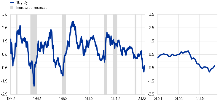 3. The predictive power of the slope of the yield curve is documented for the euro area and the United States, as well as for other advanced and emerging market economies. One of the earlier leading papers in the literature is Estrella, A. and Hardouvelis, G. A., “The term structure as a predictor of real economic activity”, The Journal of Finance, Vol. 46, No 2, 1991, pp. 555-576. For more recent surveys, see Haubrich, J. G., “Does the Yield Curve Predict Output?”, Annual Review of Financial Economics, Vol. 13, 2021, pp. 341-362, and De Backer, B., Deroose, M. and Van Nieuwenhuyze, C., “Is a recession imminent? The signal of the yield curve”, NBB Economic Review, 2019. Sabes, D and Sahuc, J. G., op. cit., finds that the lead time is six months to one and a half years for the euro area, Germany, France, Italy and Spain.