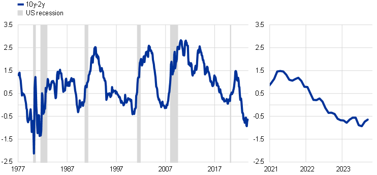 8. The risk-free curve captures information on expectations for current and future monetary policy and how it relates to the macroeconomic outlook and the compensation required by market participants for bearing interest rate risk stemming from the uncertainty surrounding both future inflation and real rates, i.e., nominal term premia. A negative slope may therefore reflect investors’ expectations that the macroeconomic outlook will worsen, inflation will decline and yields will be lower as growth slows and monetary policy loosens in response. It could also reflect expectations of overtightening and rapid course reversion. A number of other mechanisms could also be at play, such as the expected profitability channel lowering the supply of credit and constraining growth as a negative slope hampers bank profitability by reducing the spread between rates on short-term deposits and long-term loans (see Minoiu, C., Schneider, A. and Wei, M., “Why Does the Yield Curve Predict GDP Growth? The Role of Banks”, Finance and Economics Discussion Series, Vol. 49, 2023).