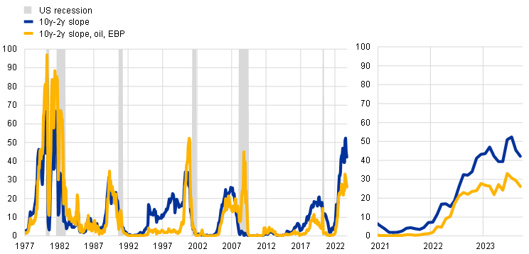 Another caveat at the present juncture is the fact that the negative nominal slope is currently driven by the real yield curve, which might weaken the signal of the simple model. Understanding why the yield curve slope is informative with regard to recession risks is challenging, as the slope contains information about monetary policy expectations, risks and views on the macroeconomic outlook, all of which are closely interlinked.[8] However, empirical analysis shows that when decomposing the nominal yield curve slope into market-based inflation compensation and real rates, the slope of the inflation compensation curve is the better predictor.[9] This implies that, in most cases, financial markets priced in an inverted inflation curve, which seems to have anticipated a cooling of the economy. Currently, the negative slope in both the euro area and the United States is mostly driven by an inversion of the real curve rather than by inflation compensation.[10] Given that the model only processes the overall slope, thus representing an average effect, it can be expected to potentially overstate the current risk of a recession.