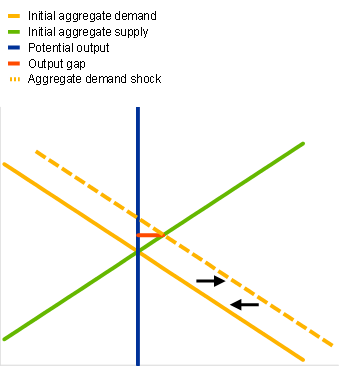 Notes: The chart illustrates the aggregate supply-aggregate demand model,[5] with output on the x-axis and inflation on the y-axis. The aggregate supply schedule represents the inflation rate that would result from firms’ pricing decisions at any given production level in the short run. The aggregate supply schedule shifts upwards (downwards) in response to changes in firms’ cost structures – such as increases (decreases) in input prices, decreases (increases) in input availability and decreases (increases) in productivity – as well as to increases (decreases) in firms’ inflation expectations. The aggregate demand schedule represents the amount of goods and services demanded by households, firms, governments and the external sector in the short run at any given level of inflation. The aggregate demand schedule shifts outwards (inwards) in response to a variety of demand shocks, for example increases (decreases) in household income, decreases (increases) in investment costs, increases (decreases) in government spending, or exchange rate depreciations (appreciations). The assumed temporary nature of the shocks depicted prompt the corresponding schedules to first shift outwards (upwards) and then back to their original positions. The output gap is measured as the horizontal distance between the equilibrium level of output and potential output. The latter is assumed to remain unchanged throughout.