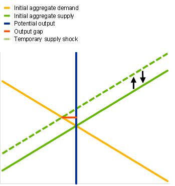 A simple aggregate demand-aggregate supply model illustrates how temporary supply shocks, which do not alter potential output, create output gaps negatively correlated with inflation.[4] The model predicts that positive aggregate demand shocks create positive output gaps while pushing up both output and inflation (Chart A, panel a). At the same time, temporary adverse supply-side shocks – that is, supply shocks that cause inflation but do not alter potential output – push output below potential. In other words, these shocks cause negative output gaps (Chart A, panel b). A simultaneous fall in output and rise in inflation that does not lead to a negative output gap can only be achieved if potential output falls at least as much as output. If potential output is not affected, and assuming there are no significant second-round effects from increasing wages, inflation will go back to the initial level. In the first case the output gap will converge to zero from a positive level, while in the second it will go back to zero from a negative level.