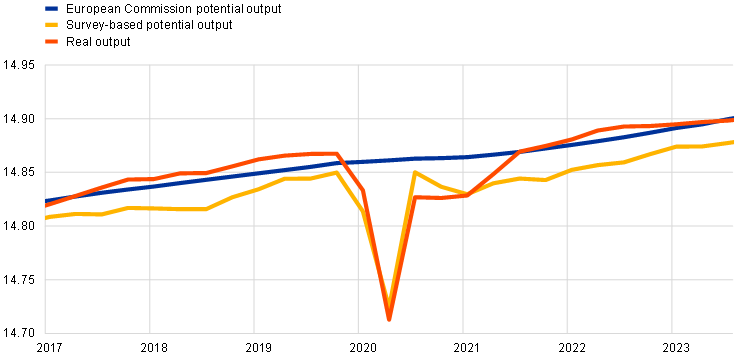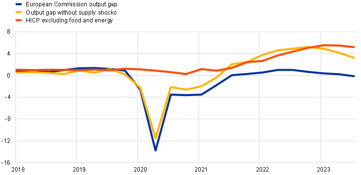 According to the estimates of major international institutions, the euro area output gap has remained negative or very close to zero in recent years, despite the rise in euro area core inflation.[1] Motivated by policy considerations related to fiscal, financial and external sustainability, the potential output estimates produced by international institutions such as the International Monetary Fund (IMF), the Organisation for Economic Co-operation and Development (OECD) and the European Commission are computed under the assumption that potential output mostly only fluctuates in response to medium-run – i.e. either permanent or highly persistent – structural shocks.[2] This approach was maintained during the pandemic and the associated supply shock, which many assumed would be transitory given the reversal of containment measures and the supporting role of macroeconomic policies.[3]