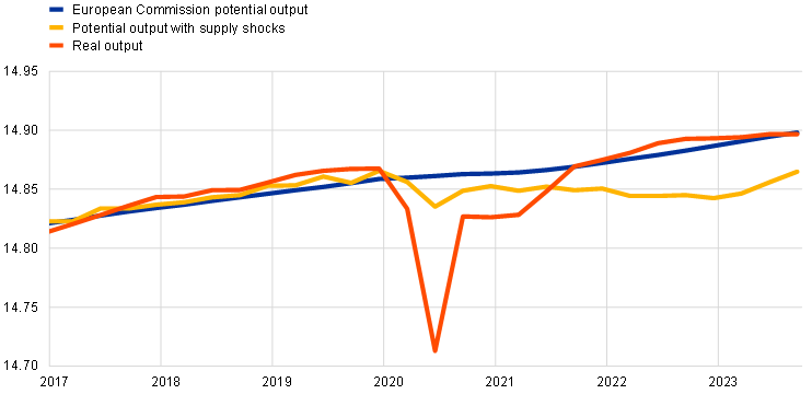 Notes: The “Output gap without supply shocks” series shows the European Commission’s output gap once the supply shocks identified by the NAWM in Chart B have been subtracted. The “Potential output with supply shocks” series shows the implicit potential output estimate resulting from the aforementioned output gap estimate.