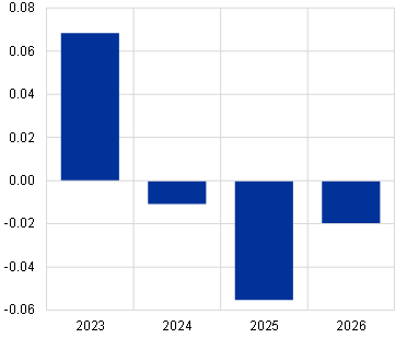 The combined effect of the green fiscal measures included in the December 2023 Eurosystem staff projections on both headline inflation and GDP growth is small over the projection horizon. The effect on euro area headline inflation is estimated to amount to around 0.1 percentage point in all years of the projection horizon, with minor variation (Chart A). For euro area real GDP growth, the effect is estimated to amount to around 0.07 percentage points in 2023 and to be negative at ‑0.01 percentage points in 2024, ‑0.06 percentage points in 2025 and ‑0.02 percentage points in 2026. The combined effect of the green fiscal measures on both headline inflation and real GDP growth are heterogenous across countries.