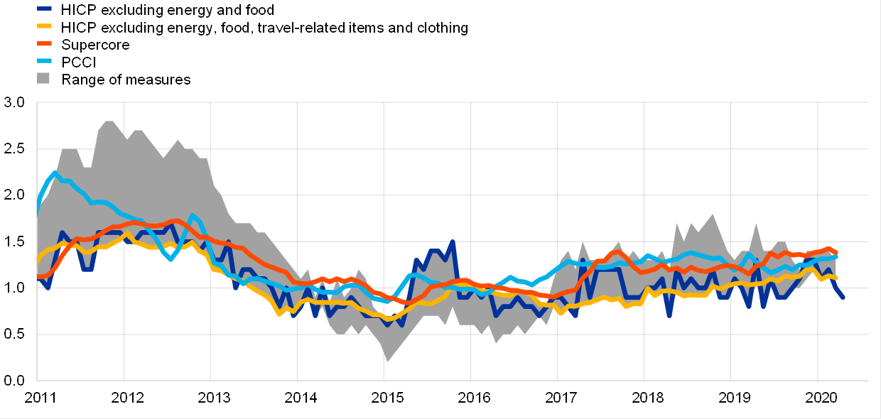 Notes: The latest observations are for April 2020 for HICP excluding energy and food (flash estimate) and for March 2020 for all other measures. The range of measures of underlying inflation consists of the following: HICP excluding energy; HICP excluding energy and unprocessed food; HICP excluding energy and food; HICP excluding energy, food, travel-related items and clothing; the 10% trimmed mean of the HICP; the 30% trimmed mean of the HICP; and the weighted median of the HICP. Growth rates for HICP excluding energy and food for 2015 are distorted upwards owing to a methodological change (see the box entitled “A new method for the package holiday price index in Germany and its impact on HICP inflation rates”, Economic Bulletin, Issue 2, ECB, 2019).