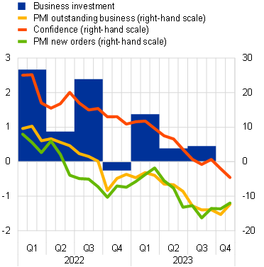 Business investment grew in the third quarter of 2023 but is expected to contract in the fourth quarter. Non-construction investment excluding Irish intangibles grew by 0.5% quarter on quarter in the third quarter of 2023, driven by rises in investment both in intangibles and in machinery and equipment (Chart 8, panel a). In the fourth quarter the continued weakness reflected in the European Commission’s confidence survey and in the PMIs for output and new orders suggests a fall in investment. Firms are also being affected by negative corporate net interest income and the support from backlogs continues to wane.[5] The Commission’s survey on limits to the production of capital goods in the fourth quarter confirmed weakening demand along with increasingly fewer impediments caused by shortages of equipment and capacity. The latter is in line with a decline in capacity utilisation in the wider economy, suggesting little need for investment to extend production capacity in the near term. Nevertheless, investment is expected to gradually recover in 2024 and beyond as demand picks up again, uncertainty recedes and as the current dampening effect of monetary policy tightening and adverse credit supply conditions fades over the medium term. In addition, the implementation of the Next Generation EU programme should crowd in private investment.