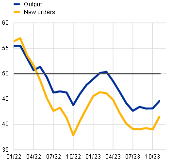 The euro area economy contracted slightly in the third quarter of 2023, mostly owing to a decline in inventories. Tighter financing conditions and subdued foreign demand are likely to continue weighing on economic activity in the near term. Prospects are especially weak for construction and manufacturing, the two sectors most affected by higher interest rates. Services activity is also set to soften in the coming months. This is due to spillovers from weaker industrial activity, fading effects from the reopening of the economy and the broadening impact of tighter financing conditions.