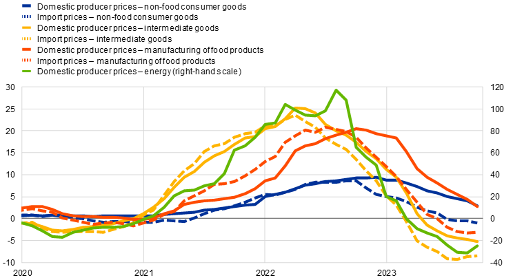 Inflation excluding energy and food dropped by almost a full percentage point over October and November 2023, falling to 3.6% in November. This reflects improving supply conditions, the fading effects of the past energy shock and the impact of tighter monetary policy on demand and on the pricing power of firms. The inflation rates for goods and services fell to 2.9% and 4.0% respectively.