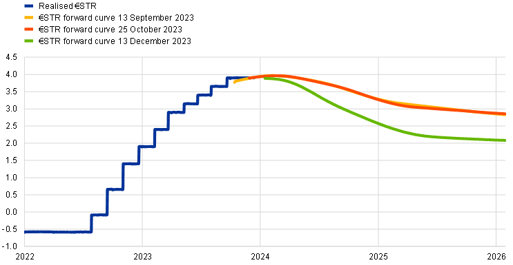 Market interest rates have fallen markedly since the Governing Council’s monetary policy meeting on 26 October 2023 and lie below the rates embedded in the staff projections. The Governing Council’s restrictive monetary policy continues to transmit strongly into broader financing conditions. Lending rates rose again in October, to 5.3% for business loans and 3.9% for mortgages.