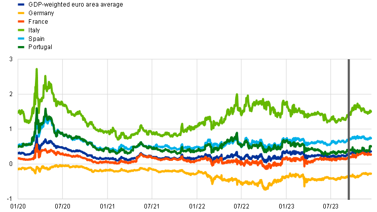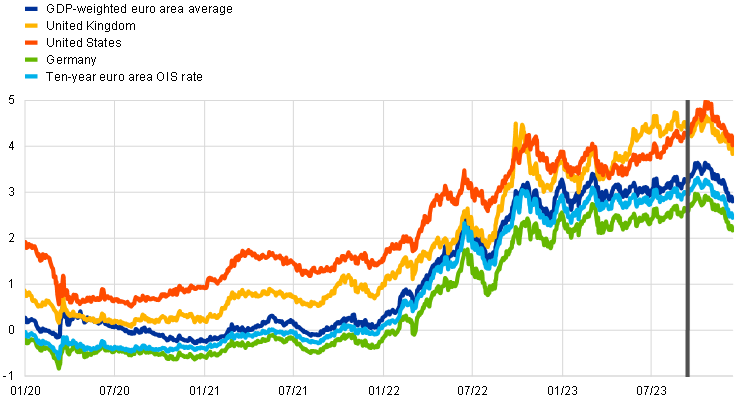 Compared with the September 2023 projections, global financial conditions fluctuated but ultimately eased slightly across advanced economies. At the start of the review period (from 14 September to 13 December 2023), they tightened considerably across advanced economies as long-term sovereign bond yields were driven up, mainly as a result of higher risk compensation owing to greater uncertainty about future short-term interest rates. However, this tightening was more than reversed after inflation came in slightly below expectations in several jurisdictions, while some central banks also softened their communication on whether additional interest rate increases would be necessary. In the United States, market expectations that inflation would soften further amid resilient but slowing growth fostered a downward shift in monetary policy expectations and supported risk sentiment. In general, the price of riskier assets moved in tandem with interest rate fluctuations to end the period slightly higher.