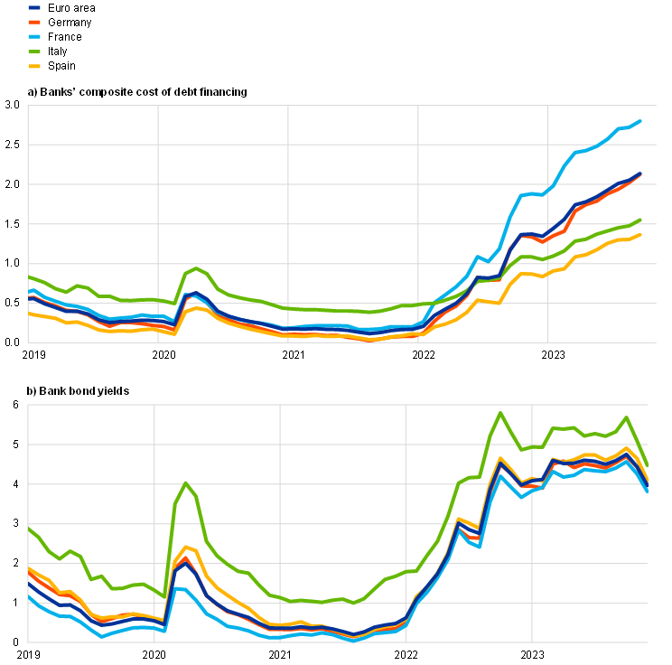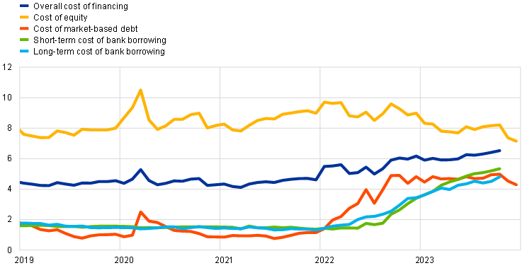 Owing to lags in the data available on the cost of borrowing from banks, data on the overall cost of financing for NFCs are only available up to October 2023.