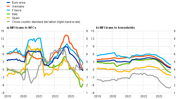Notes: Loans from monetary financial institutions (MFIs) are adjusted for loan sales and securitisation; in the case of non-financial corporations (NFCs), loans are also adjusted for notional cash pooling. The cross-country standard deviation is calculated using a fixed sample of 12 euro area countries. The latest observations are for October 2023.