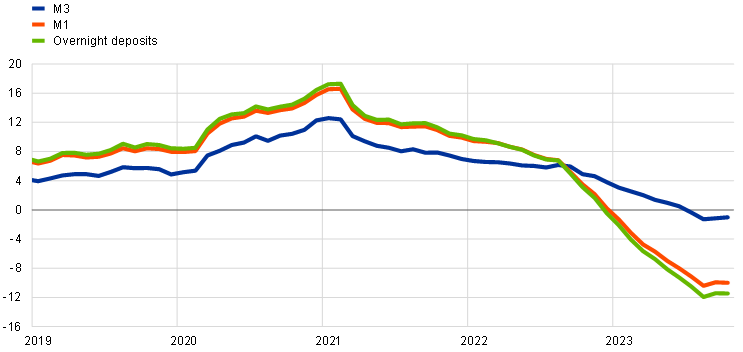 In October 2023 money growth continued to contract – with annual rates close to recent historical lows – driven by high opportunity costs, subdued credit growth and the reduction in the Eurosystem balance sheet. Annual broad money (M3) growth in the euro area stood at ‑1.0% in October, up from ‑1.2% in September (Chart 26). Annual narrow money (M1) growth declined at double-digit rates, with overall contractionary monetary dynamics being reinforced by portfolio shifts. In October it stood at ‑10.0%, down slightly from ‑9.9% in September. As in previous months, the Eurosystem’s balance sheet reduction and bank bond acquisitions by money holders continued to have a contractionary effect on monetary dynamics. In addition, repayments of TLTRO funds and the higher opportunity cost for depositors of holding liquid assets are leading banks to issue bonds with longer maturities not included in M3. At the same time, monetary dynamics have been increasingly underpinned by purchases of government bonds by banks and foreign investors, thereby bringing new money into the system, and a growing current account surplus leading to higher monetary inflows from the rest of the world.