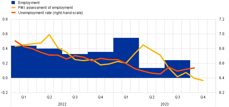 Notes: In panel a), the two lines indicate monthly developments, while the bars show quarterly data. The PMI is expressed in terms of the deviation from 50, then divided by 10. The latest observations are for the third quarter of 2023 for employment, November 2023 for the PMI assessment of employment and October 2023 for the unemployment rate. In panel b), the PMIs are expressed in terms of the deviation from 50, divided by 10.
