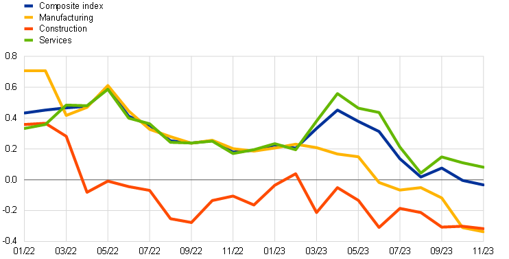 The euro area economy contracted slightly in the third quarter of 2023, mostly owing to a decline in inventories. Tighter financing conditions and subdued foreign demand are likely to continue weighing on economic activity in the near term. Prospects are especially weak for construction and manufacturing, the two sectors most affected by higher interest rates. Services activity is also set to soften in the coming months. This is due to spillovers from weaker industrial activity, fading effects from the reopening of the economy and the broadening impact of tighter financing conditions.