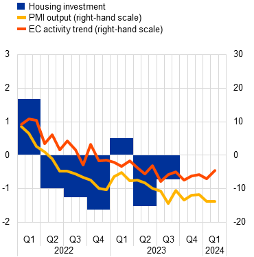 Activity is expected to remain weak in the first quarter of 2024. The composite output Purchasing Managers’ Index (PMI) stood at 48.6 on average in January and February, up from 47.2 in the fourth quarter of 2023. Although it has clearly recovered from its most recent trough of 46.5 in October 2023, the index is still below the growth threshold of 50. Across sectors, the PMI for manufacturing output remained in contractionary territory in February, despite increasing steadily from the summer of last year (Chart 5, panel a). The new orders index has shown a somewhat stronger improvement, which is likely related to declining backlogs of work. Business activity in the services sector had shown more stable dynamics at a higher, but still suppressed, level in recent months, before picking up in February, suggesting that the decline that started last year has come to a halt (Chart 5, panel b).
