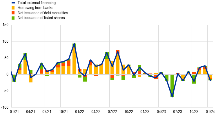 Notes: Net external financing is the sum of borrowing from banks (MFI loans), net issuance of debt securities and net issuance of listed shares. MFI loans are adjusted for loan sales, securitisation and cash-pooling activities. The latest observations are for January 2024.