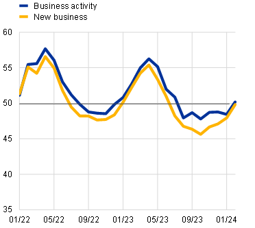 Short-term labour market indicators suggest continuing employment growth in the first quarter of 2024. The monthly composite PMI employment indicator rose from 50.1 in January to 51.2 in February, suggesting a further increase in employment. This indicator declined substantially from its peak of April 2023, but has edged up again in the last two months, driven by the services sector (Chart 6, panel b). The PMI services indicator increased from 51.2 in January to 52.7 in February. By contrast, the PMI manufacturing indicator remained in contractionary territory.