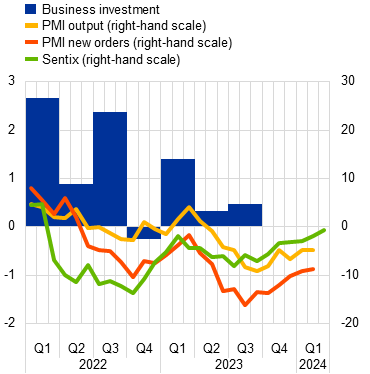 Business investment is likely to have contracted sharply in the fourth quarter of 2023 and is expected to remain weak in the short term. An aggregation of available country data for non-construction investment (excluding Irish intangibles) points to a decline of 1.6%, quarter on quarter, in the fourth quarter of 2023, while industrial production in the euro area capital goods sector (excluding Ireland), which supplies investment goods to firms in the euro area and beyond, fell further.[7] Against a backdrop of depleted order backlogs, which had supported business investment in the past few quarters, the sharp drop in the fourth quarter likely reflected weak activity amid strong monetary policy transmission. With regard to the short-term outlook, the PMI for the capital goods sector showed a slowdown in the decline of output and new orders in the fourth quarter of the year (Chart 8, panel a). However, more forward-looking data for the wider economy, as reflected in the Sentix investor confidence sub-index for the coming six months, have been indicating a recovery since September 2023, with the index rising to a quarterly average not seen since the start of 2022. Moreover, the January 2024 euro area bank lending survey reported that demand for longer-term loans (typically used for fixed capital investment) was expected to rebound into positive territory in the first quarter of 2024. Further ahead, delayed disbursements of Next Generation EU funds are also expected to help crowd in business investment related to the green and digital transitions.