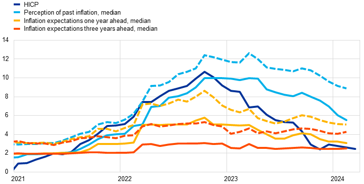 Most measures of underlying inflation fell further in February, confirming the picture of gradually diminishing price pressures. While domestic inflation remains high, wages and unit profits grew less strongly than anticipated in the last quarter of 2023, but unit labour costs remained high, in part reflecting weak productivity growth. More recent indicators point to further moderation in wage growth.