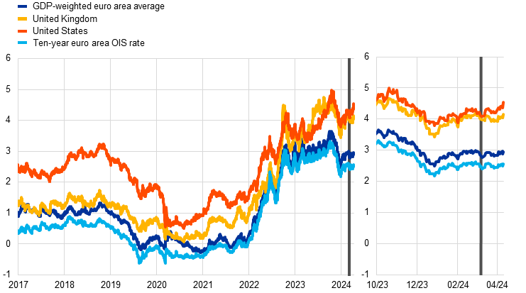 In the United States, activity and price developments continue to suggest a soft landing. High-frequency indicators point towards robust but decelerating economic activity in the first quarter. Consumer spending continues to support economic activity, but the delayed effects of the Federal Reserve System’s restrictive monetary policy are expected to weigh on future economic activity. Moreover, the US labour market increasingly shows signs of cooling, with wage growth moderating and the number of people voluntarily quitting their job falling. Annual headline consumer price inflation, however, increased by 0.3 percentage points to 3.5% in March as energy prices rose, while core inflation remained stable at 3.8%. Services inflation in particular is expected to decline only gradually, potentially resulting in a sluggish downward path for inflation in the months ahead. In its March meeting, the Federal Open Market Committee (FOMC) maintained policy rates at between 5.25% and 5.5%. FOMC members revised their forecast for GDP in 2024 up considerably, to 2.1% from 1.4% in fourth-quarter-over-fourth-quarter terms, mainly reflecting better-than-expected data. Revisions to the inflation outlook for this year were much smaller, up by just 0.2 percentage points.