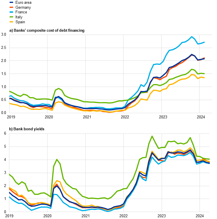 Notes: Composite bank funding costs are a weighted average of the composite cost of deposits and unsecured market-based debt financing. The composite cost of deposits is calculated as an average of new business rates on overnight deposits, deposits with an agreed maturity and deposits redeemable at notice, weighted by their respective outstanding amounts. Bank bond yields are monthly averages for senior tranche bonds. The latest observations are for February 2024 for banks’ composite cost of debt financing and for 4 April 2024 for bank bond yields.
