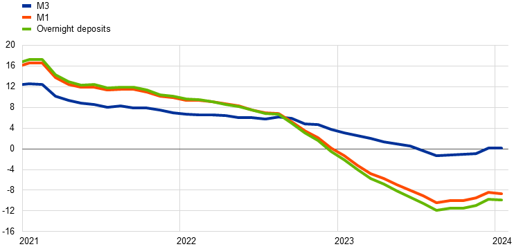 The annual growth rate of broad money (M3) increased in February 2024 but remained low, driven by high opportunity costs, stagnant lending and the further reduction in the Eurosystem balance sheet. M3 growth in the euro area increased to 0.4% in February, up from 0.1% in January (Chart 20). Annual growth for narrow money (M1) – which comprises the most liquid assets of M3 – contracted further, but its pace slowed to ‑7.7% in February, compared with ‑8.6% in January. After a sizeable monthly outflow in January, M3 recorded a monthly inflow in February, driven by a decline in central government deposits and by increased lending to other financial institutions amid stagnant lending to the private sector. Money creation was dampened in February by the issuance of long-term bank bonds, the further reduction in the Eurosystem balance sheet and, for the first time since September 2022, a negative contribution from external sector financial transactions amid higher short-term volatility.